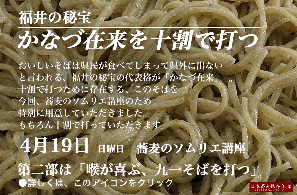 ⬇︎ 4月は、福井の宝物そば、「かなづ在来」を十割で打っていただきます。写真をクリックして、詳細をご覧ください。
